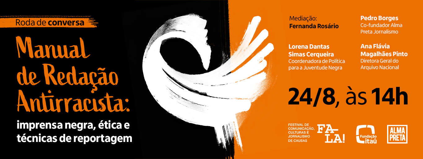 No próximo sábado (24), às 14h, a Alma Preta Jornalismo e Fundação Itaú se juntam para o debate Imprensa negra, ética e técnicas de reportagem, na quinta edição do FALA! Festival de Comunicação, Culturas e Jornalismo de Causas. O evento acontece de 22 a 24 de agosto na Universidade da Amazônia (Unama), em Belém (PA), com uma programação que contempla performances artísticas, rodas de conversa e mesas de debate com referências da comunicação. As novidades deste ano incluem sessões de exibição audiovisual e oficinas técnicas.